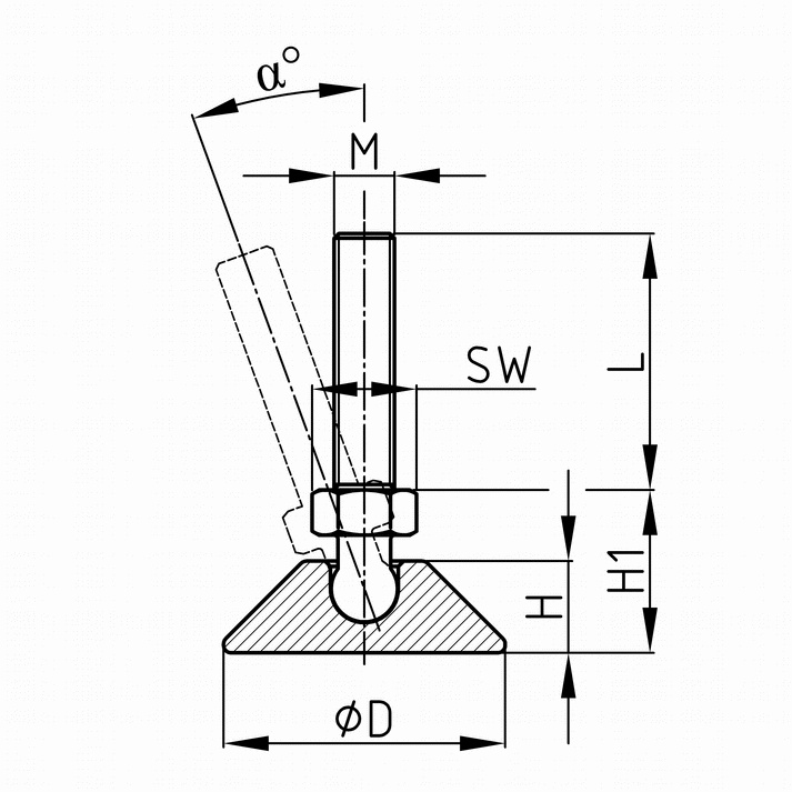 Stavitelný šroub – kloubový kluzák s ocelovým kulovým čepem, kulatá dosedací plocha