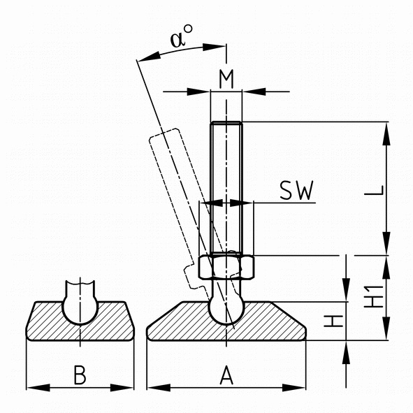 Stavitelný šroub – kloubový kluzák s ocelovým kulovým čepem, hranatá dosedací plocha