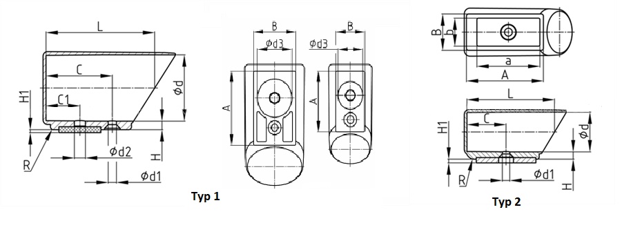 | Rozměr Typ | Rozměr a | Rozměr A | Rozměr b | Rozměr B | Rozměr C | Rozměr C1 | Rozměr d | Rozměr d1 | Rozměr d2 | Rozměr d3 | Rozměr H | Rozměr H1 | Rozměr H2 | Rozměr Lca. | Objednací číslo | |