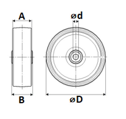 | Rozměr D - Průměr kolečka | Rozměr A - Šířka běhounu | Rozměr d - Osa kolečka | Rozměr B - Délka náboje | Rozměr Hmotnost | Rozměr Dynamická nosnost | Rozměr Statická nosnost | Objednací číslo | |