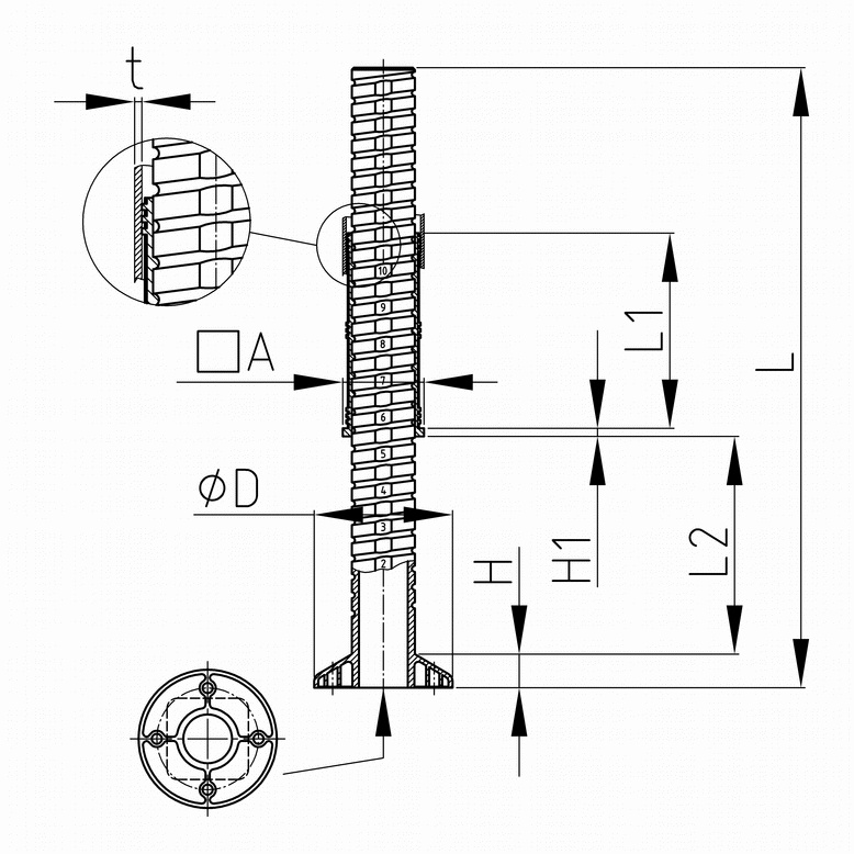 Vysokozátěžová stavitelná čtvercová záslepka s kulatou dosedací plochou