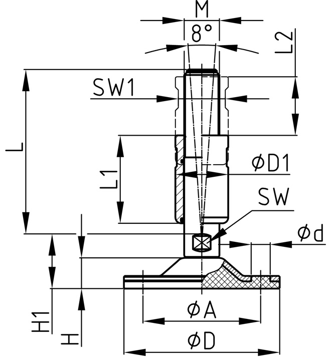 Úvod Sortiment Noha nerezová ocel/guma – závit nerezová ocel Noha ke strojům s těsnícím pouzdrem a upevňovacími otvory – nerez