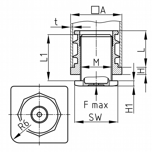 | Rozměr A | Rozměr F max. kg | Rozměr H | Rozměr H1 | Rozměr L | Rozměr L1 | Rozměr M | Rozměr SW | Rozměr t | Objednací číslo | |