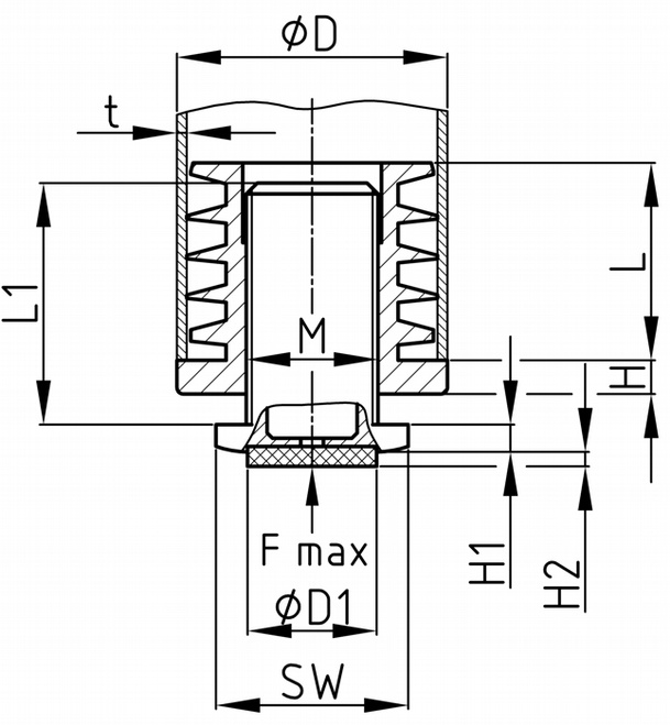 | Rozměr D | Rozměr D1 | Rozměr F max. kg | Rozměr H | Rozměr H1 | Rozměr H2 | Rozměr L | Rozměr L1 | Rozměr M | Rozměr SW | Rozměr t | Objednací číslo | |