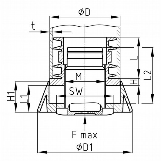 | Rozměr D | Rozměr D1 | Rozměr F max. kg | Rozměr H | Rozměr H1 | Rozměr L | Rozměr L1 | Rozměr L2 | Rozměr M | Rozměr SW | Rozměr t | Objednací číslo | |