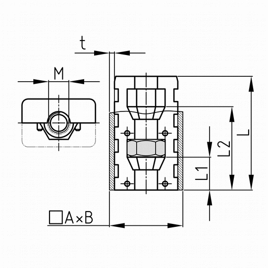 Dvoudílné pouzdro bez límce má kuželové komory pro šestihranné matice nebo šrouby