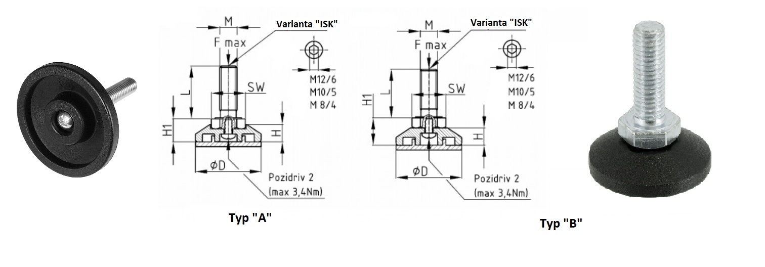 Stavěcí šroub s otočnou (B) nebo pevnou plastovou hlavou (A) S možností protiskluzové (TPE), přišroubovatelné (BF) nebo kluzné podložky (GP) – PODLOŽKY JE NUTNÉ OBJEDNAT ZVLÁŠŤ!